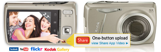- One-button upload to YouTube, FACEBOOK, FLICKR and KODAK Gallery